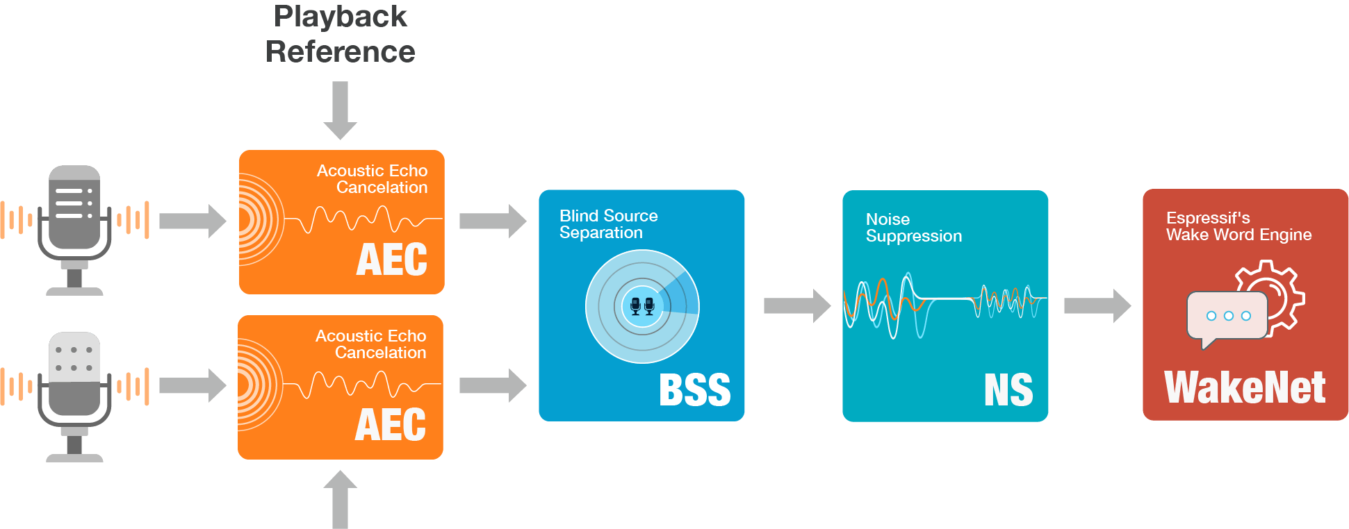Espressif's AFE algorithms deliver exceptional far-field performance. These algorithms use our proprietary wake word engine, designed to meet stringent test requirements for multi-language support.