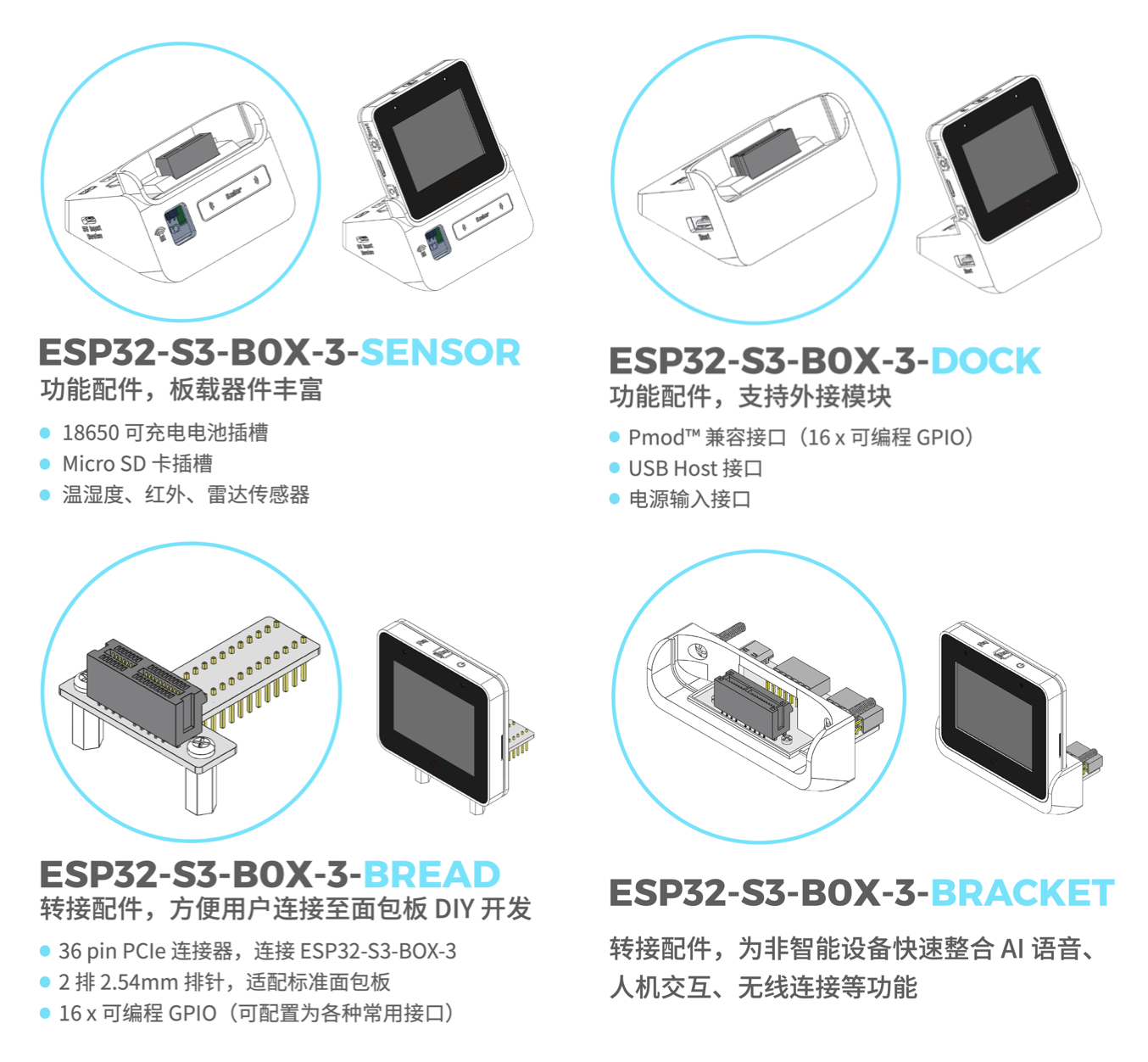 ESP32-S3-BOX-3 还提供了丰富的配件。ESP32-S3-BOX-3-SENSOR 和 ESP32-S3-BOX-3-DOCK 是两个功能配件。SENSOR 拥有多个板载器件,如温湿度传感器、红外发射器和接收器、雷达传感器等。DOCK 包含两个 Pmod™ 兼容接口(16 个可编程 GPIO),支持用户外接其他模块。ESP32-S3-BOX-3-BREAD 转接配件专用于将 BOX-3 连接至标准面包板进行 DIY 开发。ESP32-S3-BOX-3-BRACKET 转接配件能够将 BOX-3 集成到任何非智能设备中,为其快速整合 AI 语音、HMI、无线连接等功能。